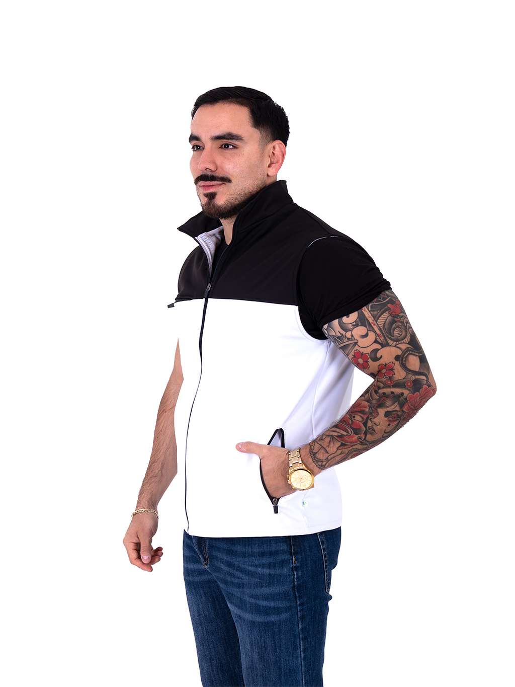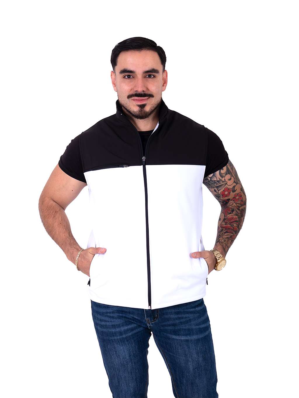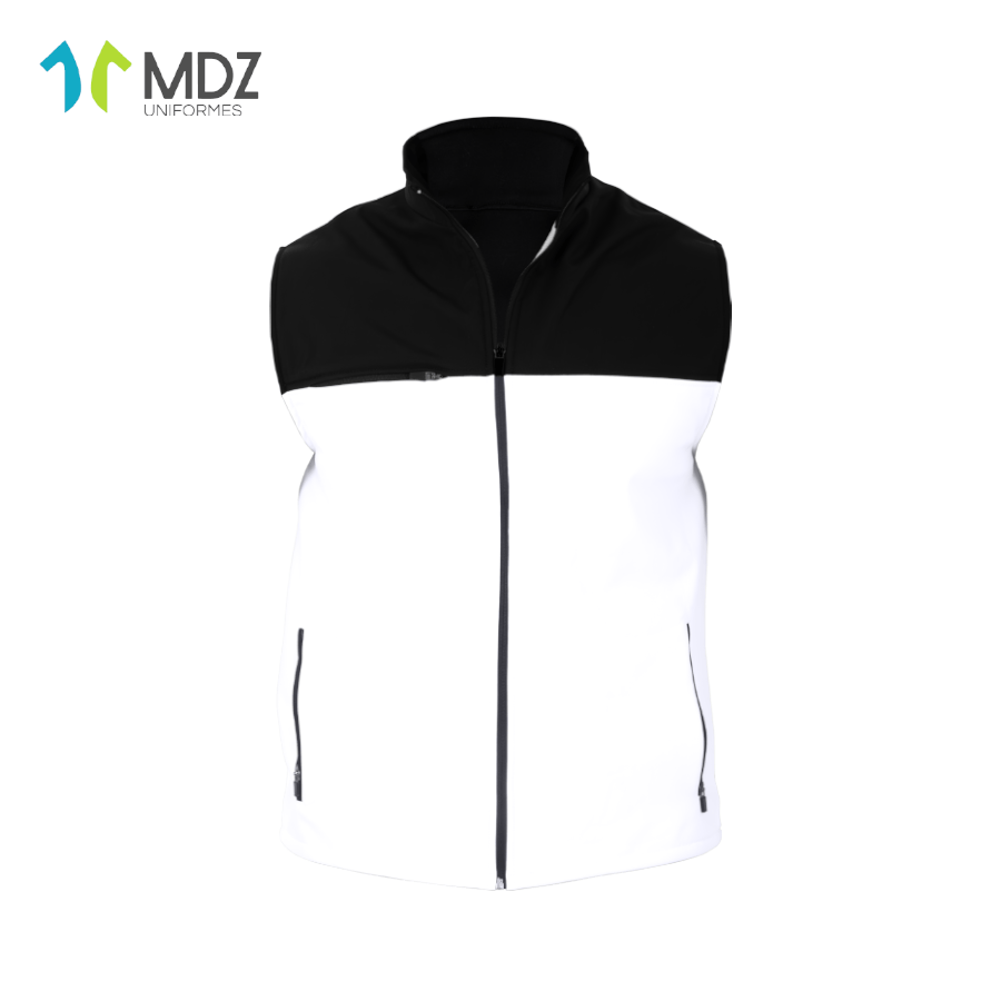 Chaleco combinado negro con blanco y cierre frontal