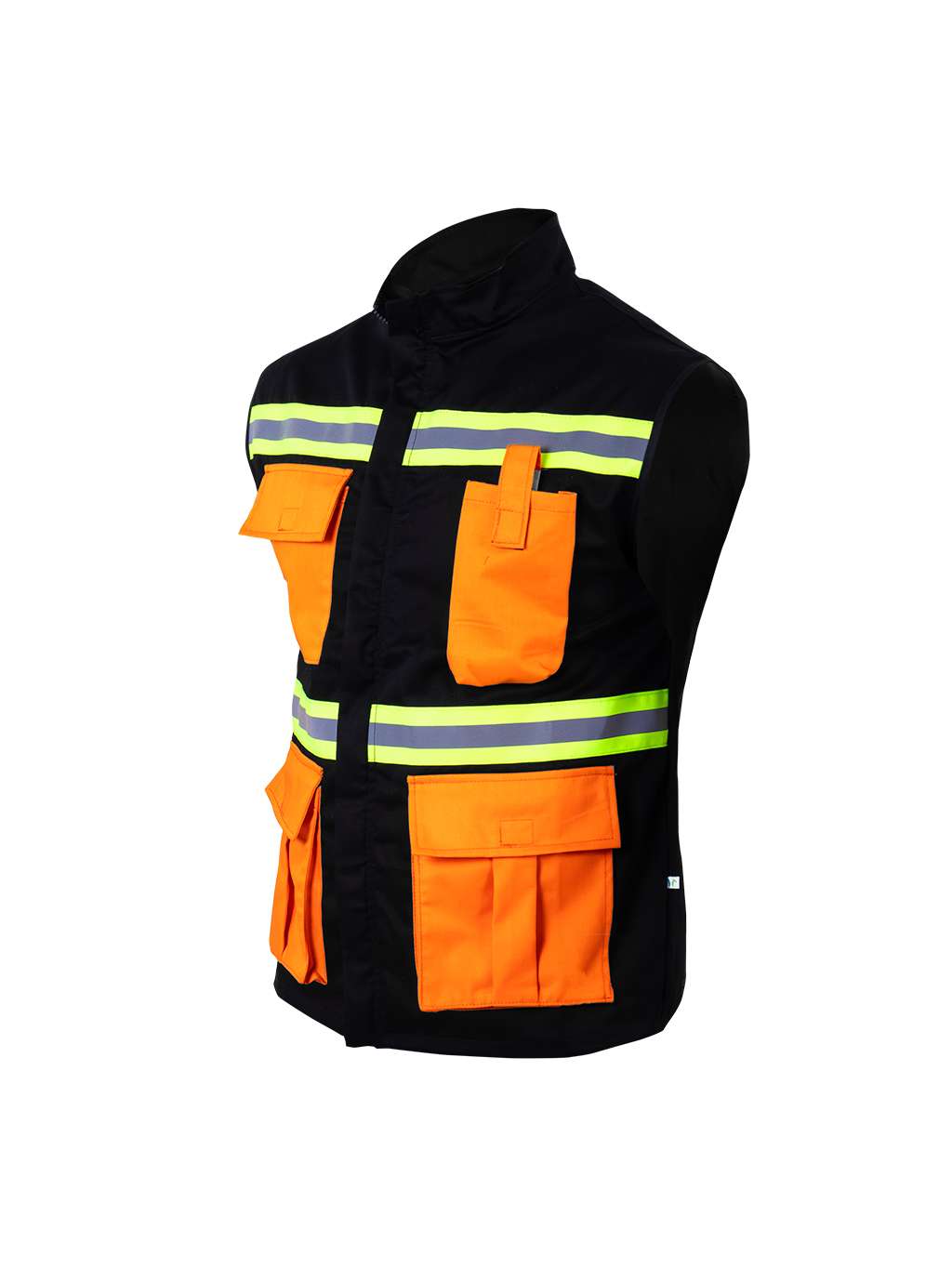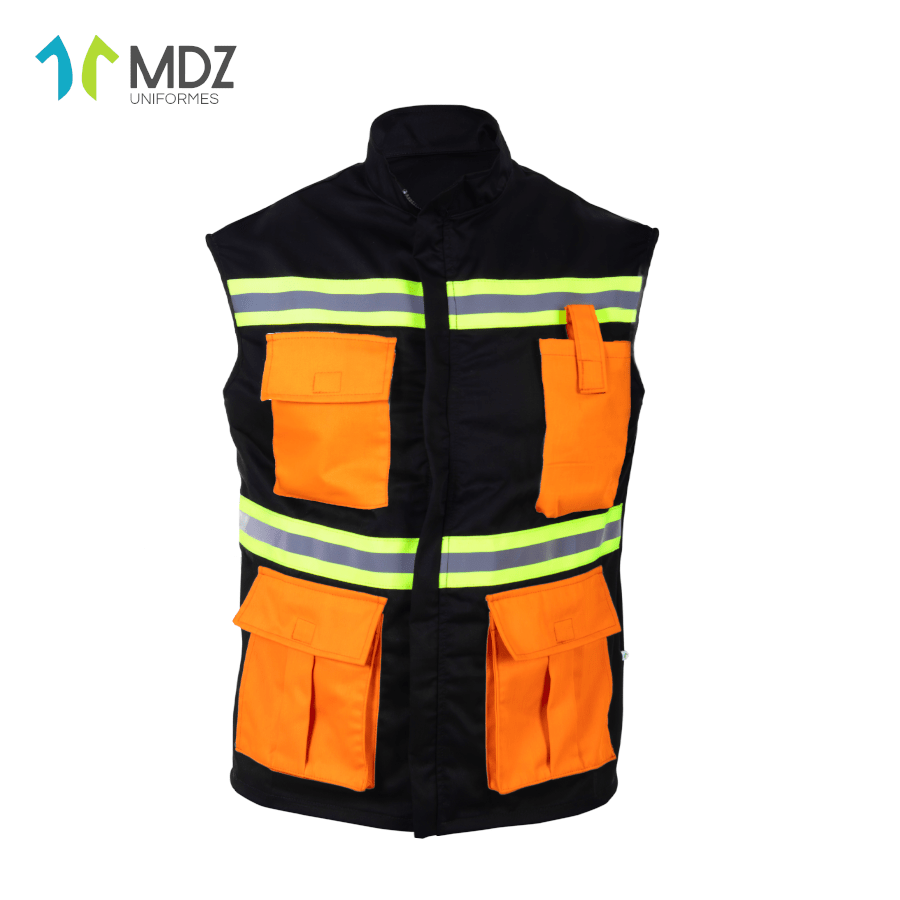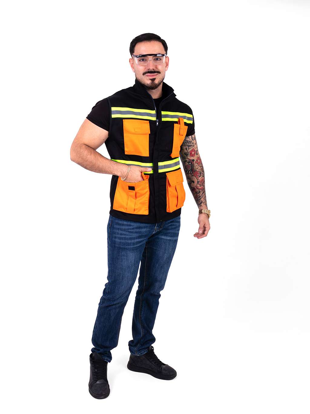 Chaleco de seguridad bicolor negro con bolsas naranjas